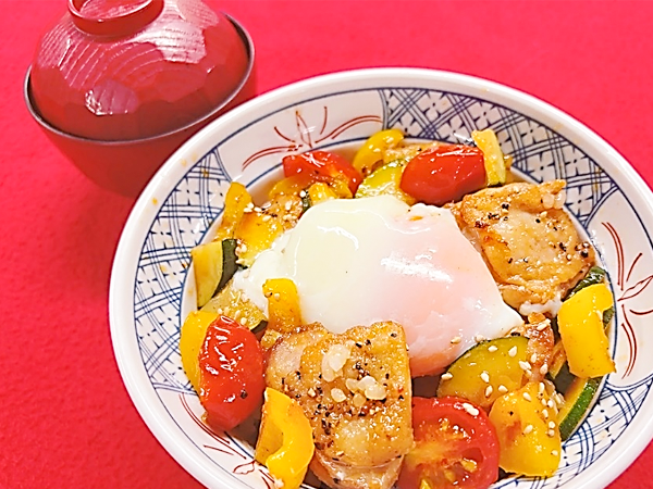 - 彩り野菜と鶏の旨辛スタミナ丼+580円